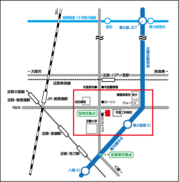 - ●近畿自動車道・東大阪南ICから、車で5分